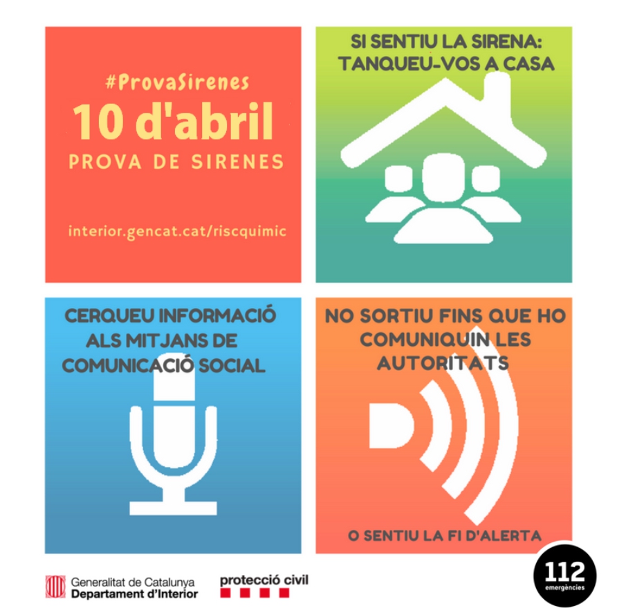 El proper 10 d'abril, dimarts, es farà una nova prova de sirenes d'avís a la població per risc químic, la primera d'enguany. El to d'alerta s'activarà a les 12.20 h, i el de fi d'alerta, a les 12.30 h. Les proves de sirenes per risc químic les duu a terme la Direcció General de Protecció Civil de la Generalitat de Catalunya, dins el pla PlaseQCat.