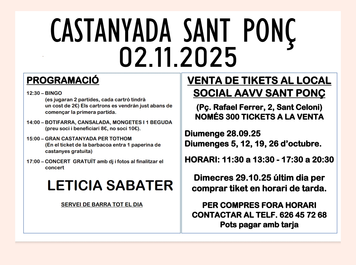 Castanyada 2025 a Sant Ponç amb Letícia Sabater en concert organitzat per l'Associació de veïns del barri de Sant Ponç