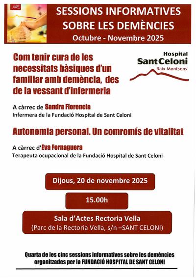 Diferents professionals de la Fundació Hospital de Sant Celoni exposaran coneixements sobre el tractament integral de les demències. Les xerrades es desenvoluparan cada dijous, fins al 27 de novembre, a la sala d'actes de la Rectoria Vella, a les 3 de la tarda.