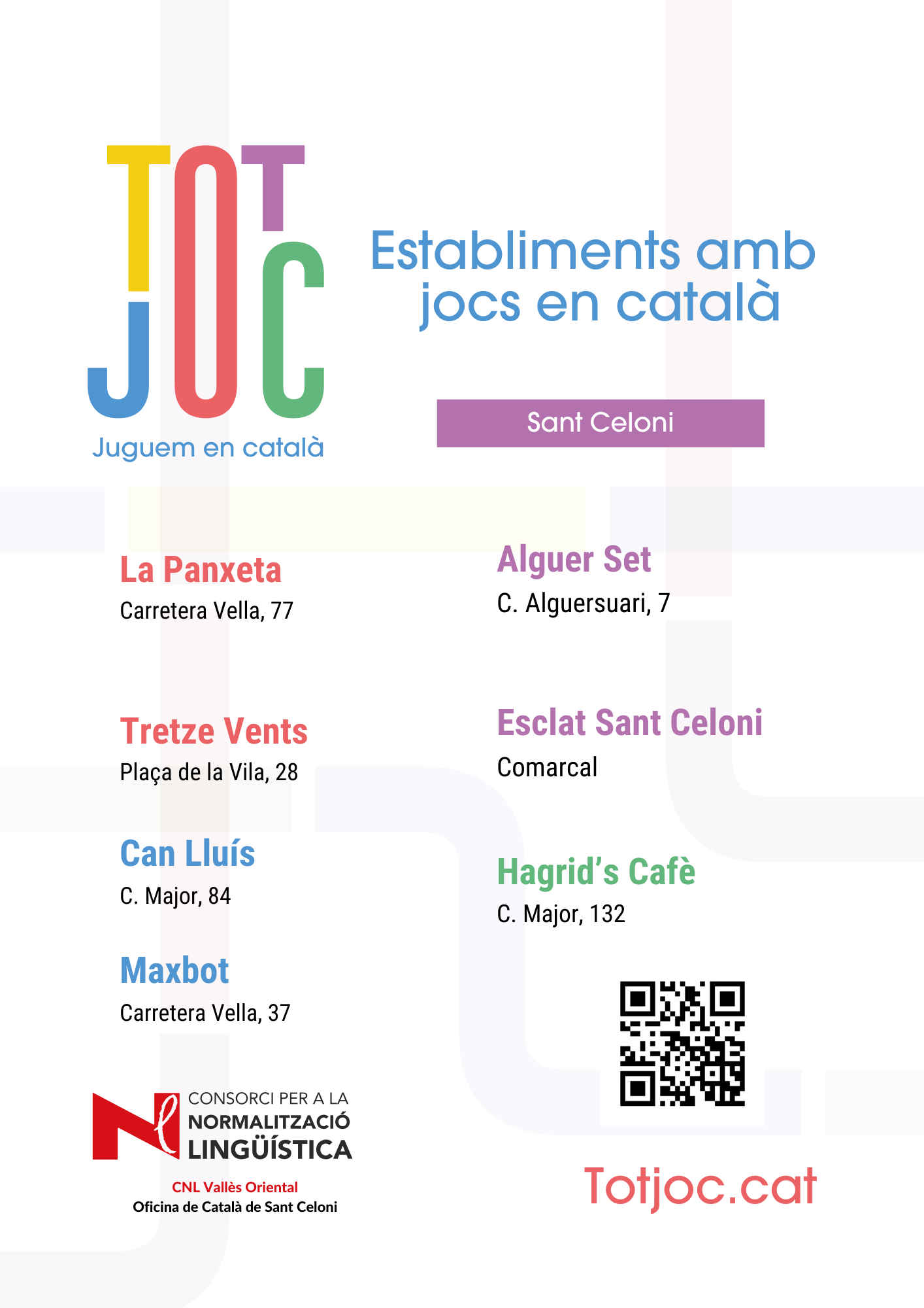 A Sant Celoni hi ha 7 establiments adherits a Totjoc on podreu trobar jocs i joguines en català: Can Lluís, Hagrid’s Cafè, Esclat Sant Celoni, La Panxeta, Llibreria Alguerset, Maxbot i Tretze Vents.