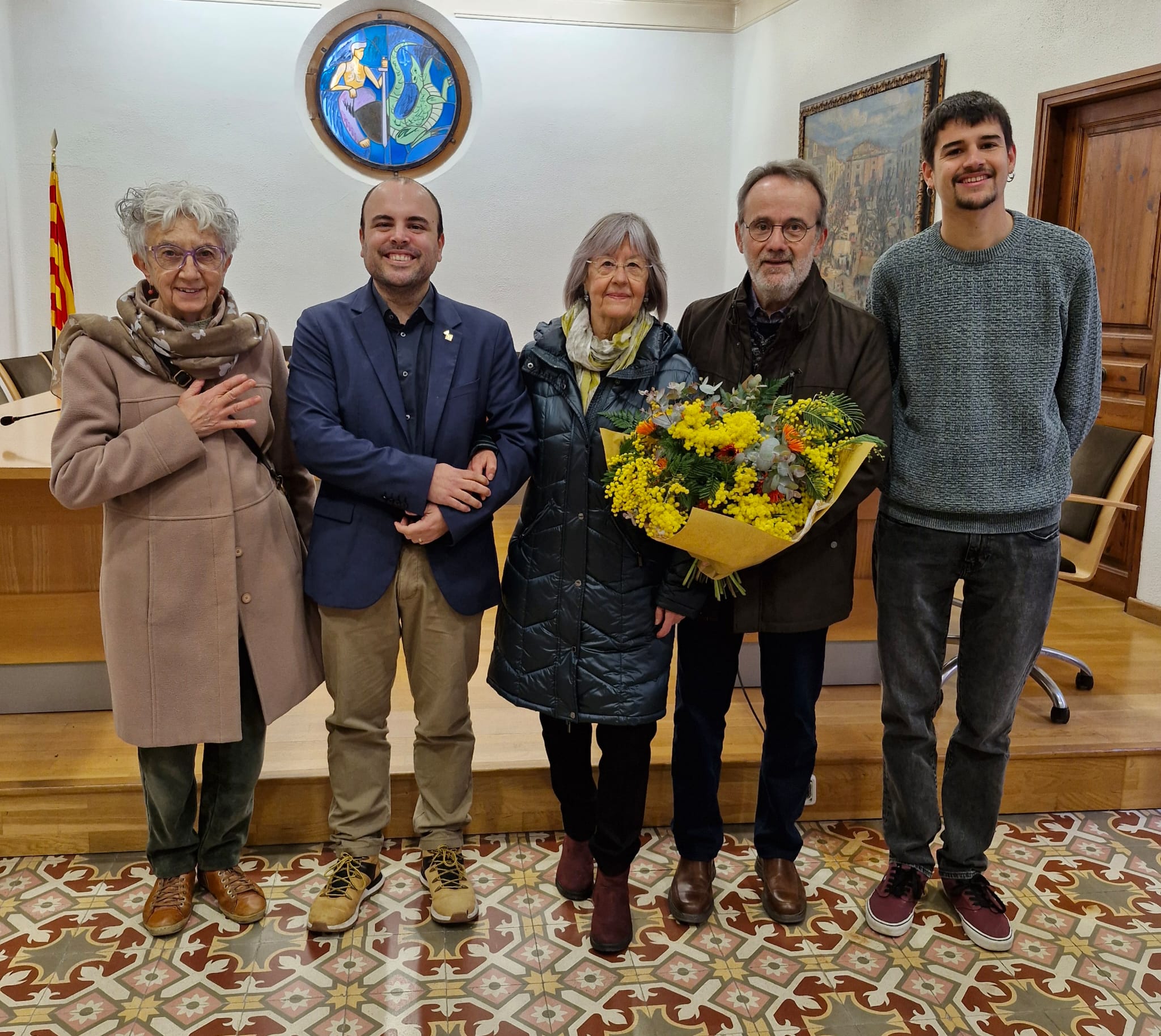 L'alcalde Eduard Vallhonesta, el primer tinent d'alcalde, Albert Planas, i Enriqueta Amadó com a representant de la Colla del Ferro han rebut Rafael Jiménez, conegut com a Fali, avui al matí com a convidat d'honor del Ball de Gitanes 2026 on se li ha fet entrega d'un ram de flors.