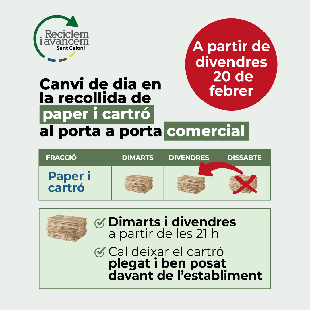 A partir del divendres 20 de febrer de 2026, canvia el dia en la recollida de paper i cartró al porta a porta comercial. Així la recollida d'aquest residu es farà els dimarts i els divendres, en lloc dels dissabtes com es feia ara.