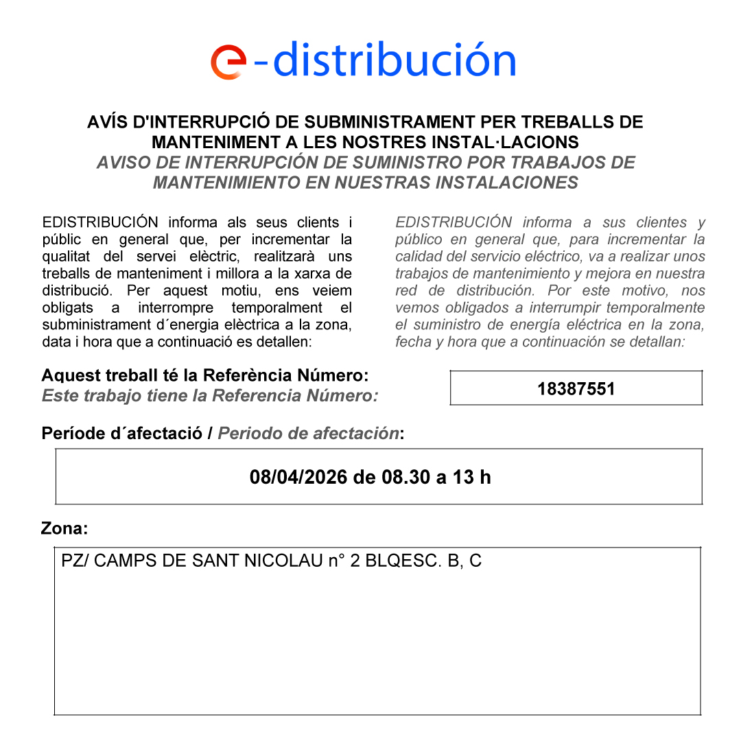 Avís d'interrupció del subministrament elèctric per dimecres 8 d'abril de 2026: