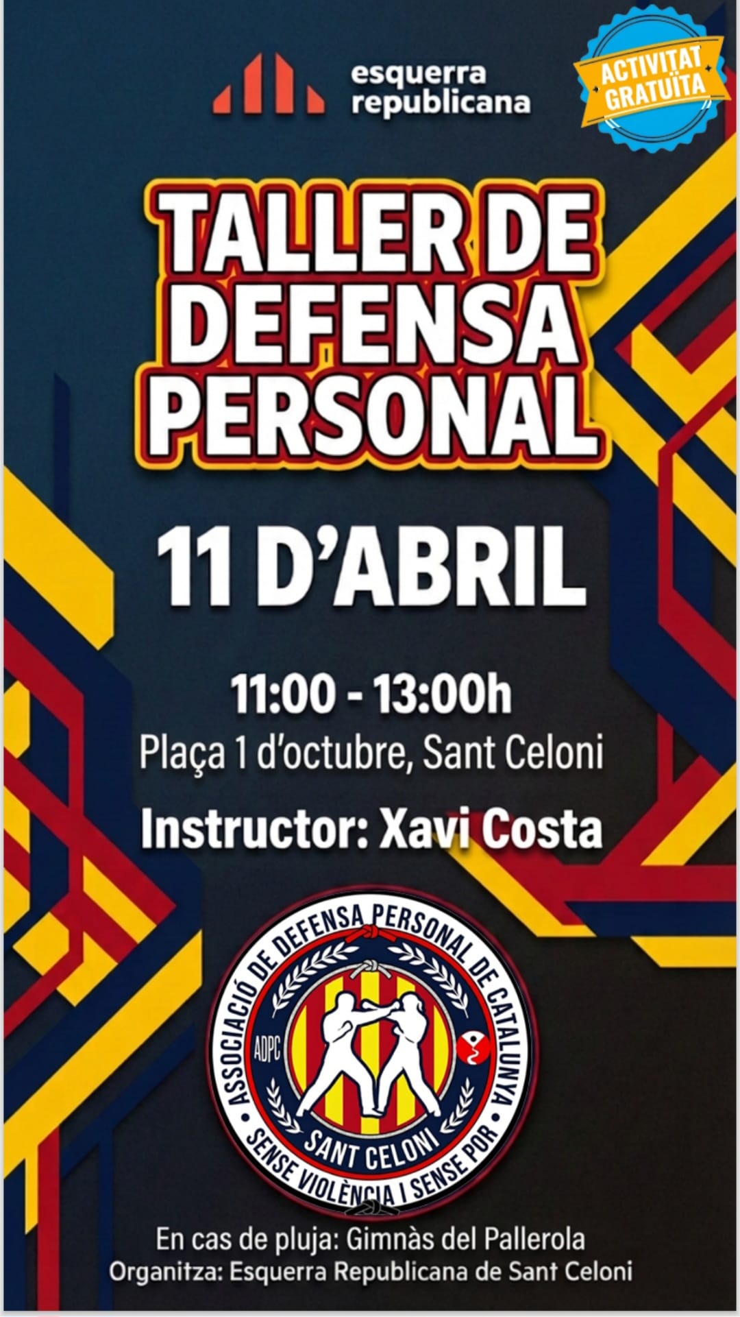 Dissabte 11 abril 2026 11:00 h | ![]() | Esports Taller de defensa personal a càrrec de l'Associació Taekwondo Sant Celoni a la plaça 1 d'Octubre | Lloc: Plaça 1 d'Octubre Adreça: Plaça 1 d'Octubre Durada: 2 hores Organitza: Esquerra Republicana de Sant Celoni Preu: Gratuït |