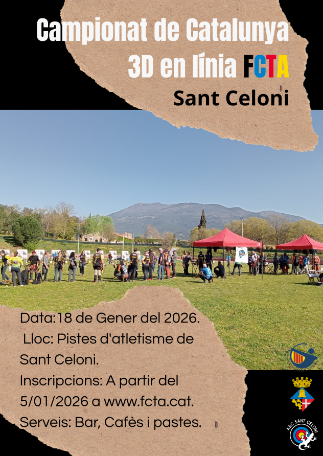 Diumenge 18 gener 2026 10:00 h | ![]() | Esports 1r Campionat de Catalunya de Tir amb Arc 3D en línia | Lloc: Pista municipal d'atletisme Adreça: Ctra. Campins, km. 1 Durada: de 10 a 14 h Organitza: Club Arc Sant Celoni |
