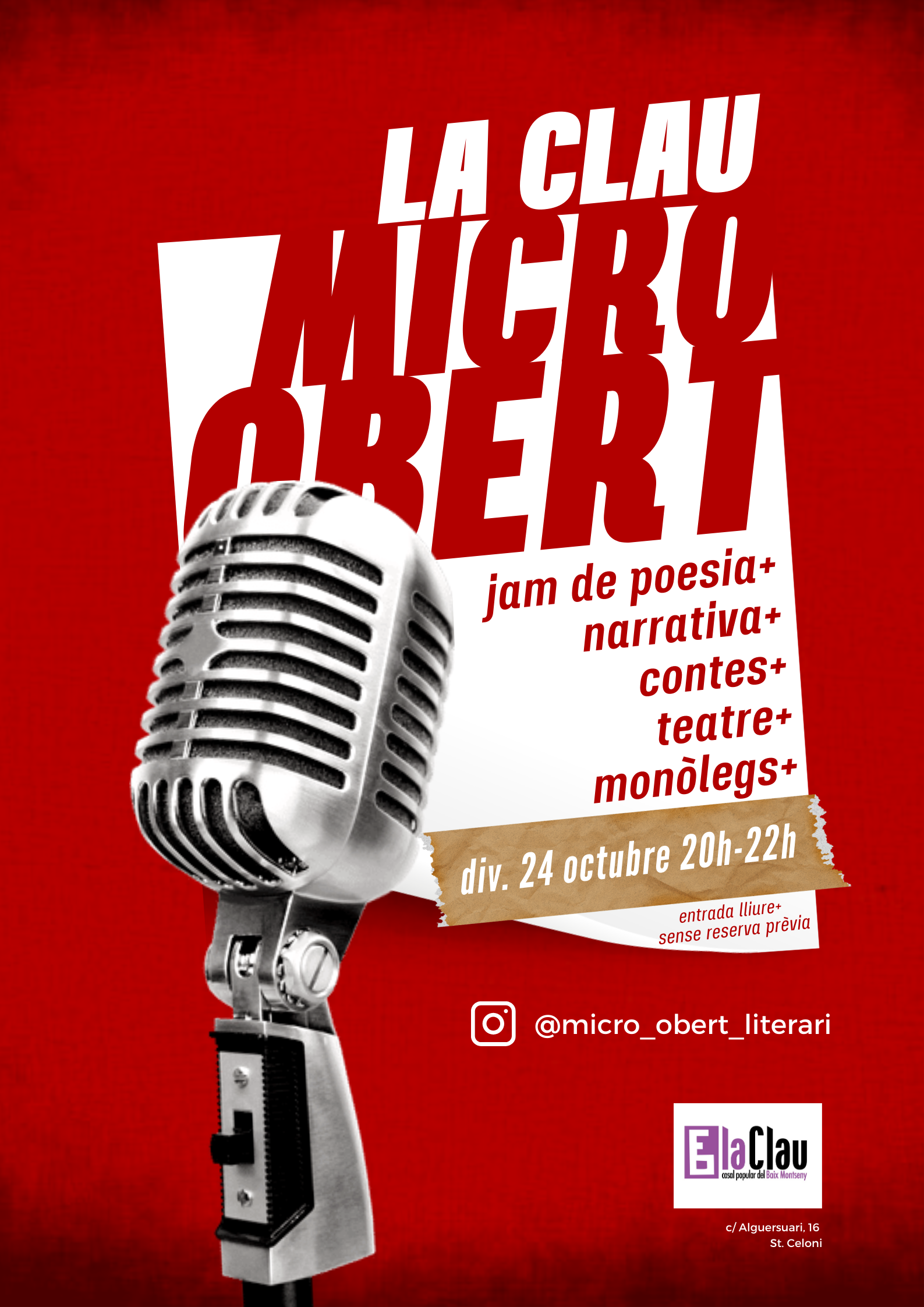 Divendres 24 octubre 2025 20:00 h | ![]() | Cultura | Literatura Micro Obert Literari a la Clau | Lloc: La Clau Adreça: c. Alguersuari, 16 Durada: de 20 a 22 h Organitza: Micro Obert Preu: Entrada Lliure |