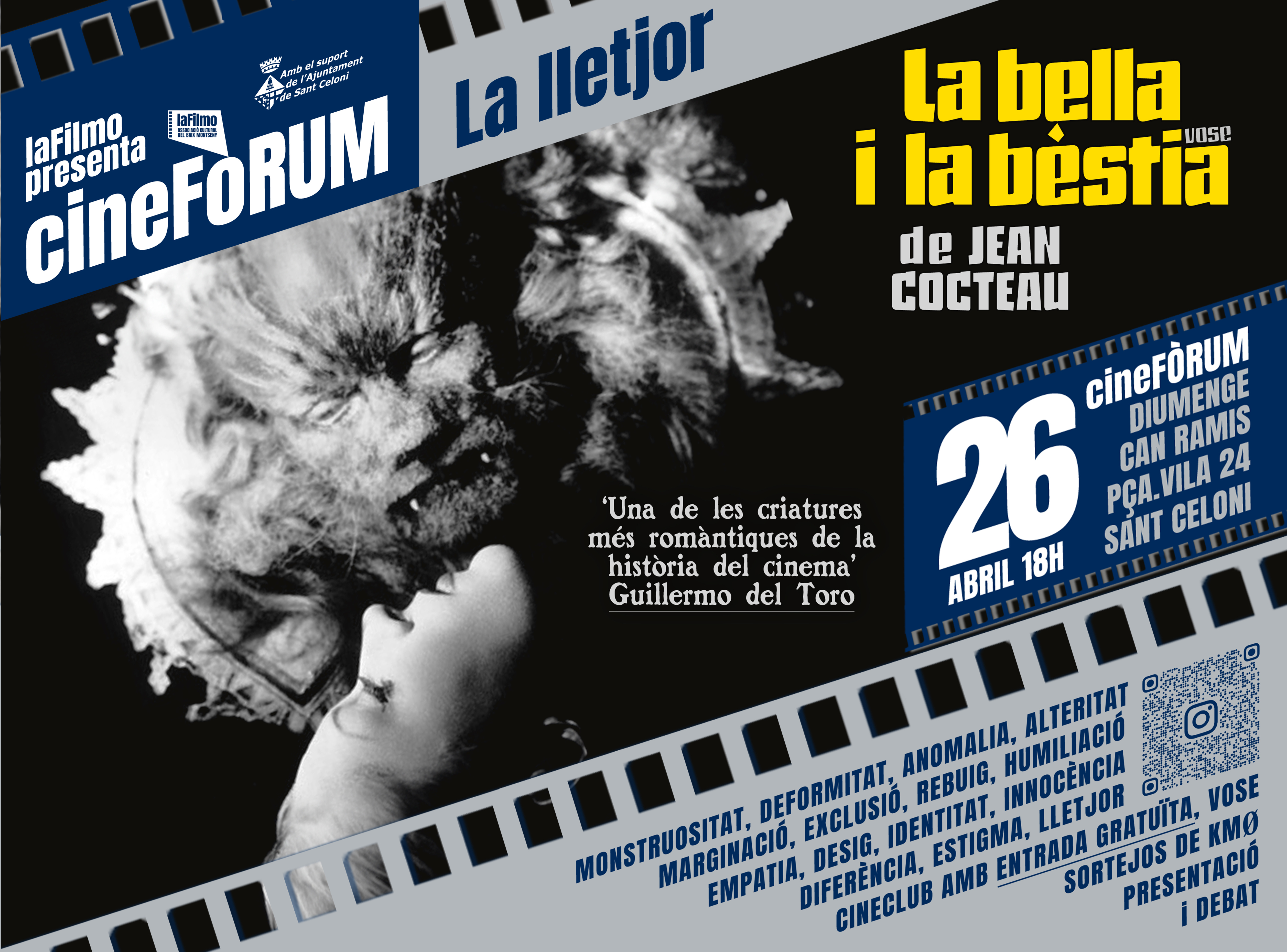 Diumenge 26 abril 2026 18:00 h | ![]() | Cinema | Conferència | Cultura El CineFòrum de laFilmo: La Bella i la Bèstia (La Belle et la Bête) de Jean Cocteau a la Sala Bernat Martorell | Lloc: Sala Bernat Martorell de Can Ramis Adreça: Pl. de la Vila, 25 Durada: 2,5 hores aprox Organitza: laFilmo del Baix Montseny Preu: Entrada lliure |