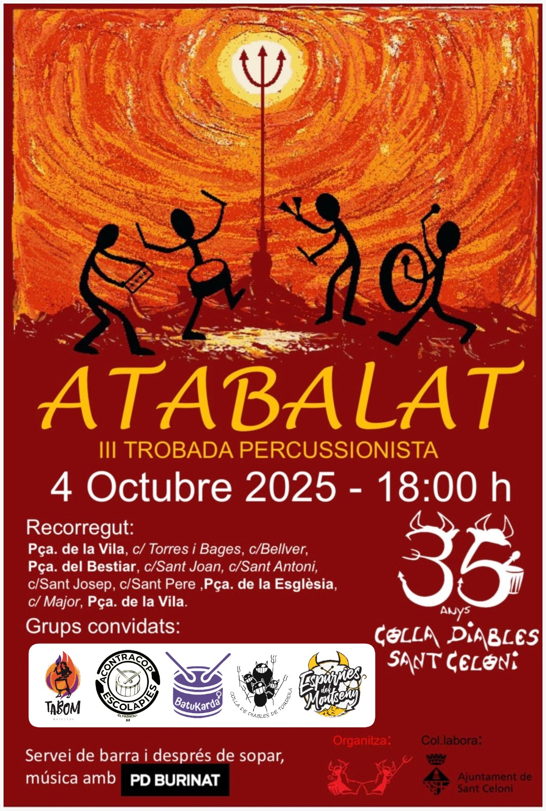 Dissabte 4 octubre 2025 18:00 h | ![]() | Cultura III Trobada Percussionista Atabalat amb els Timbalers de la Colla de Diables de Sant Celoni | Lloc: Plaça de la Vila Adreça: Plaça de la Vila Durada: De les 18 a les 24 h Organitza: Timbalers de la Colla de Diables de Sant Celoni Preu: Activitat gratuïta |