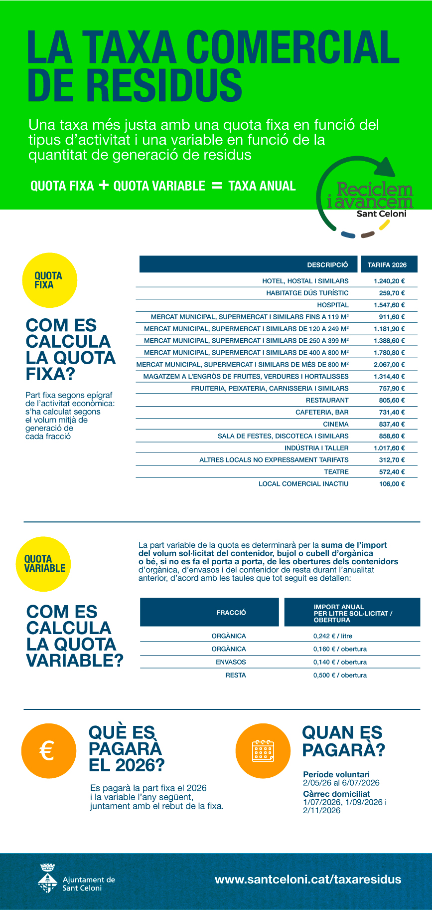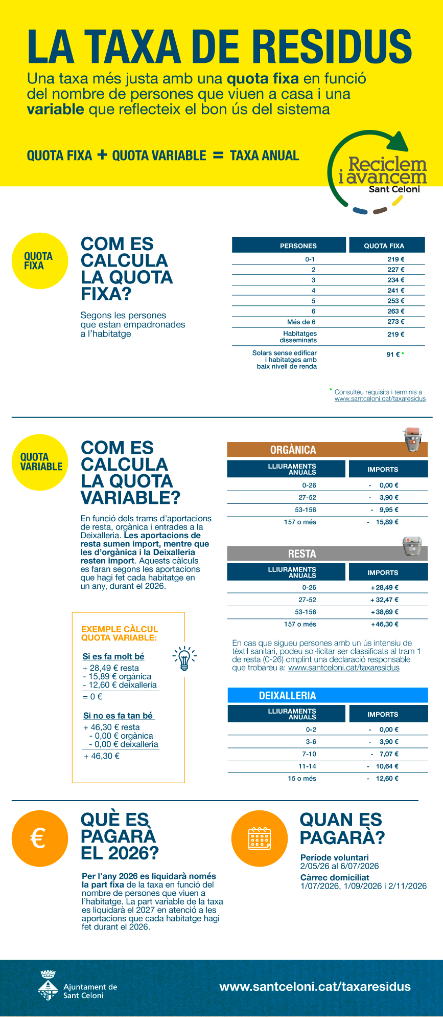 El Ple municipal de l'Ajuntament de Sant Celoni ha aprovat, en la sessió celebrada el dimarts 23 de desembre de 2025, l'Ordenança Fiscal relativa a la Taxa per a la prestació del Servei de Gestió de Residus Municipals per al 2026 i següents.