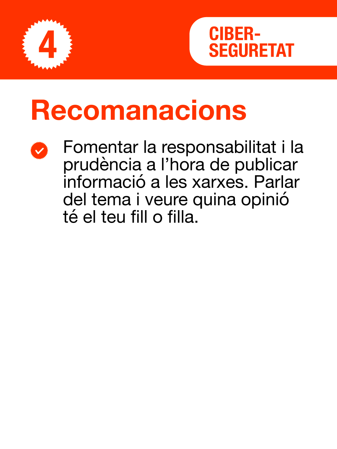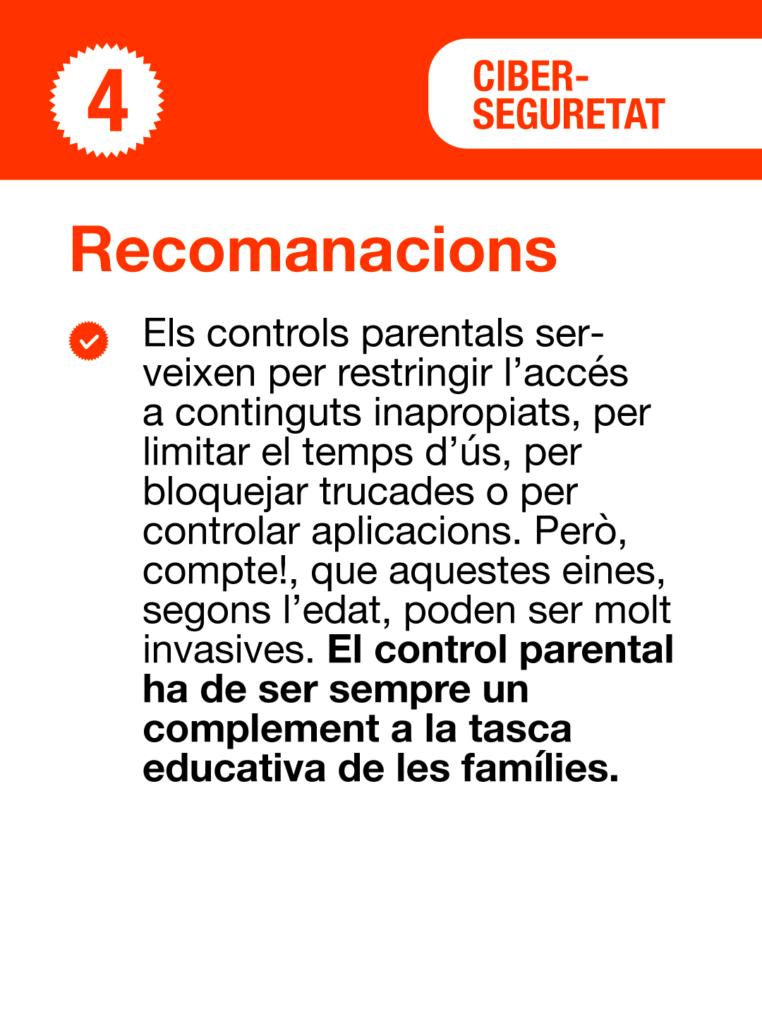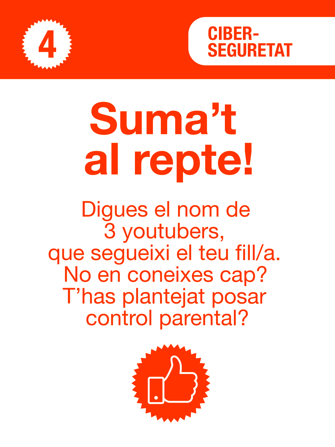La ciberseguretat centra el quart repte de la Campanya de sensibilització sobre l'ús de les pantalles a partir d'una pregunta inicial: Digues el nom de 3 youtubers que segueixi el teu fill/a. No en coneixes cap? T'has plantejat posar control parental?