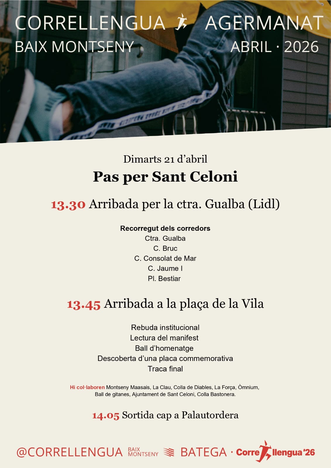 CorrellenguaEl Correllengua Agermanat de 2026 tindrà lloc entre el 19 d'abril i el 5 de maig i recorrerà el territori en disset etapes passant per Sant Celoni dimarts 21 d'abril al migdia. A dos quarts de dues del migdia arribarà per la carretera de Gualba en direcció a la plaça de la Vila on tindrà lloc l'acte de rebuda institucional al Correllengua amb la col·laboració de diverses entitats: Montseny Maasais, La Clau, Colla de Diables, La Força, Òmnium Cultural Vallès Oriental, Colla del Ferro, Colla Bastonera Quico Sabaté i Ajuntament de Sant Celoni i la coordinació de Correllengua Baix Montseny i Batega.